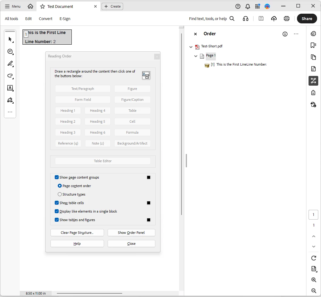The PDF file is tagged, and PAC (PDF Accessibility Tool) reports the structure as valid. Acrobat also shows the structure, ordered according the expected reading order: