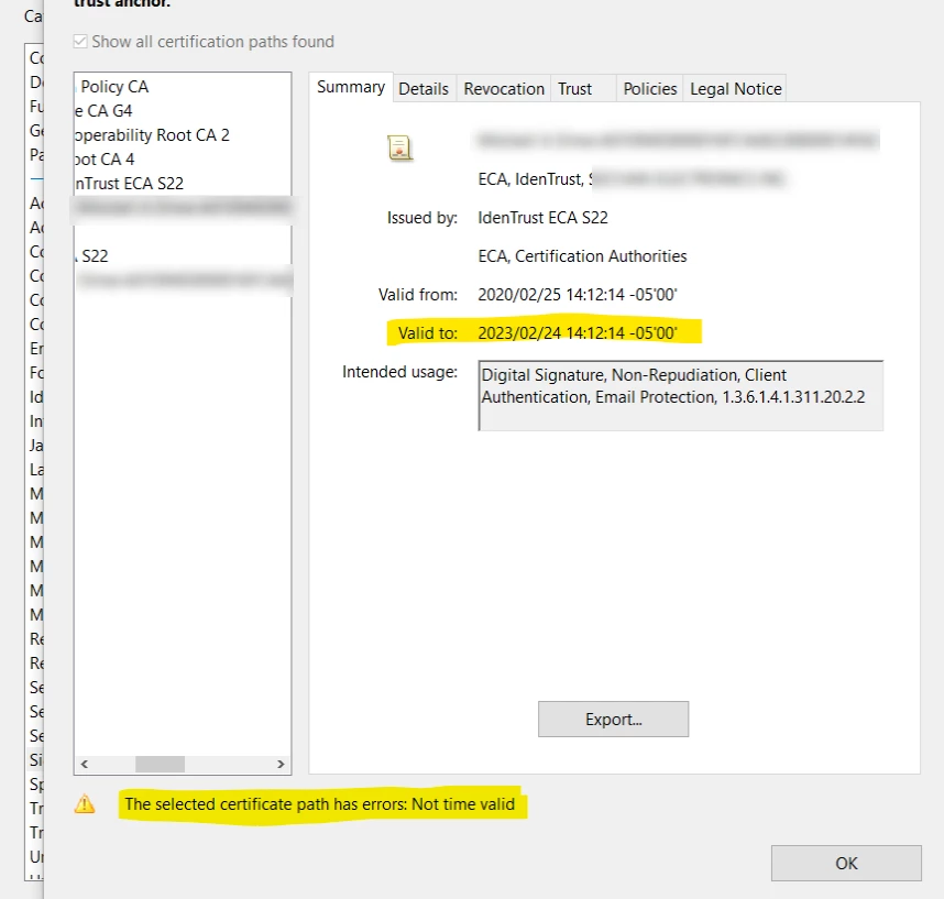 "The selected certificate path has errors: Not time valid"