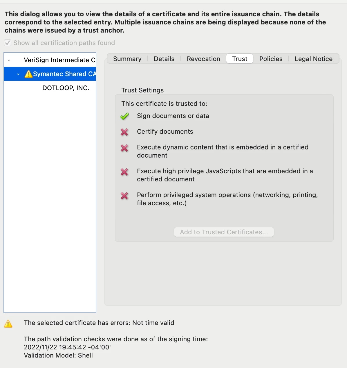 "The selected certificate path has errors: Not time valid"