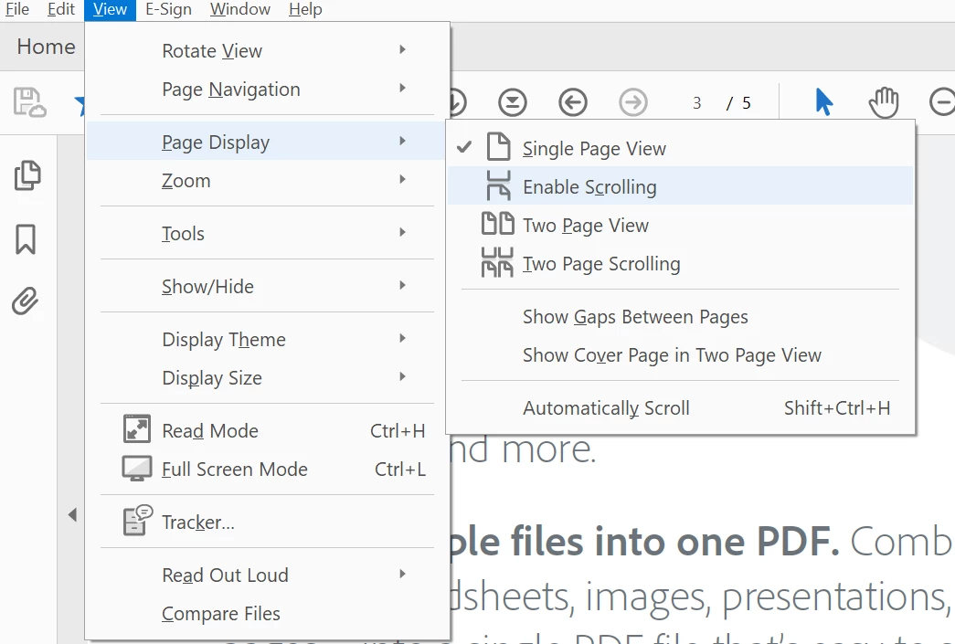 Open Acrobat/Reader>View>Page Display> Change from Single Page View to Enable Scrolling > Close and reopen the application.