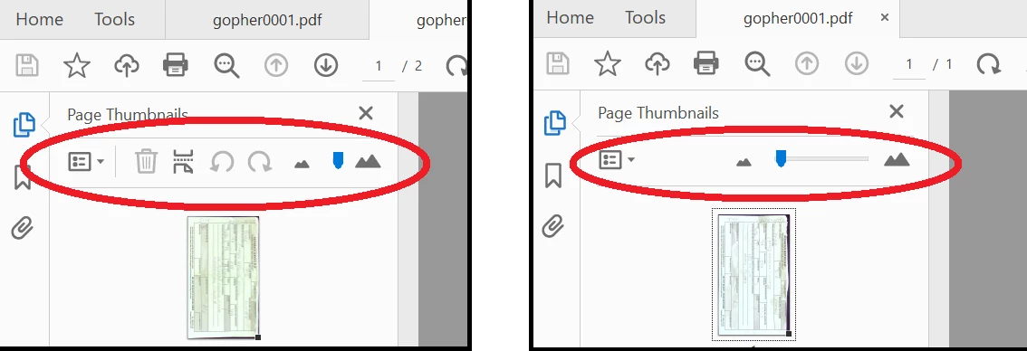 Using Acrobar PRO DC, I want the Thumbnails panel to (1) always be open and to (2) show the toolbar with buttons for rotate, etc.  Also, sometimes when I manually open the panel, it will only have an option to control font size there and I cannot figure any way to get back to the normal toolbar.  (see image).