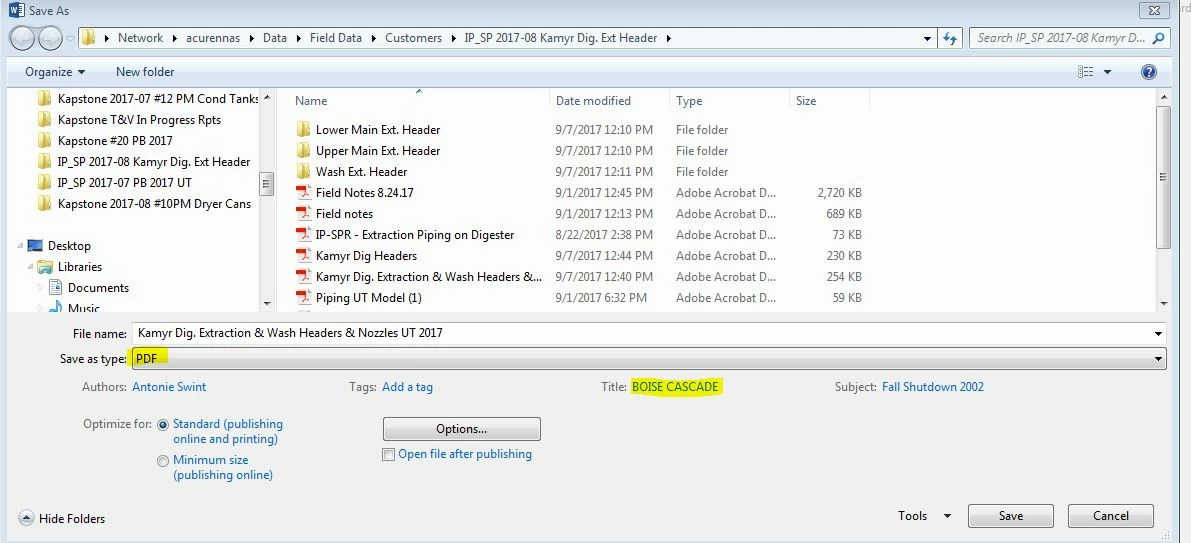 No matter how many times I "save as", I still have this showing up in my title bar: "BOISE CASCADE - Adobe Acrobat Standard DC". The title I have the PDF saved as is "Kamyr Dig Headers". Where on earth do I go to fix this? Can't find anything on this in the help pages / searches. Making me crazy.