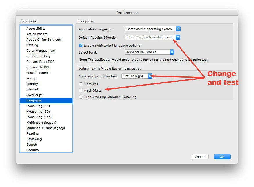 Any way, most likely your document has some Arabic text which makes Acrobat switch to Right-to-Left behaviour… I guess. Would you try changing some language settings as shown below and test your document.
