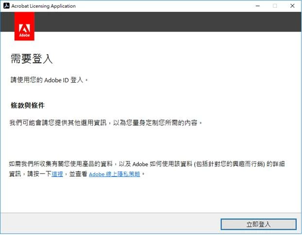 The installation was successful but when the application starts first time, I was prompted to login with Adobe account. I type in the account email and password then click continue, the application got stuck in the “Acrobat Licensing Application” window.