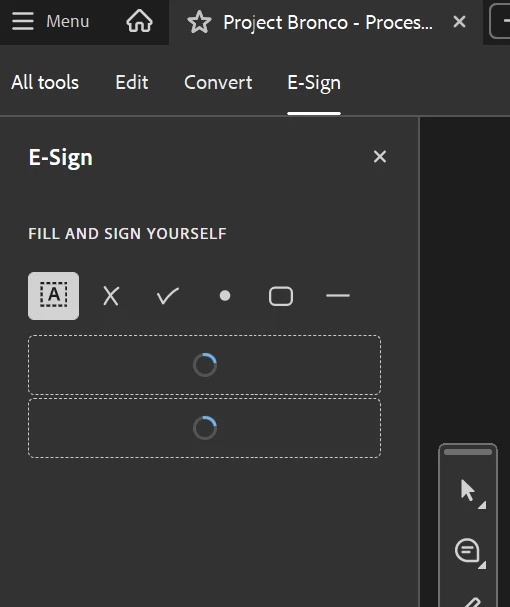Hello team, we are trying to add E-Signature to PDF files but for some reason the plus options never showed up. It always has a spinning circle and never works out. We have a workaround below from someone but it never works on one of the laptops. Any suggestions would be much appreciated.