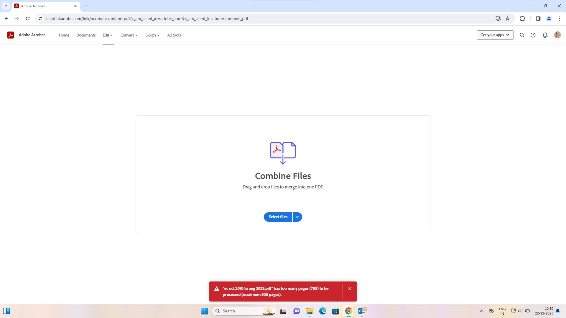 Unable to combine file error too many pages 706 max 500