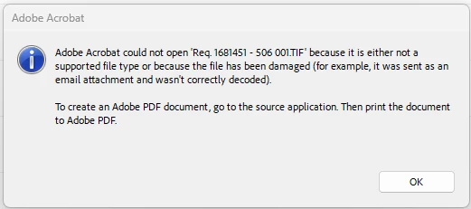 Apologies to hear and thanks for reporting. Single and multiple tiff files are combining file for me. I'm thinking the file may have some issues. Can you please confirm if it's one such TIFF files for AdobeError1.png issue or, multiple tiff files the issue is observed.. Please let me know, your Acrobat and OS version as well. Also, please share one such tiff file where issue is there in converting to pdf. Thanks!