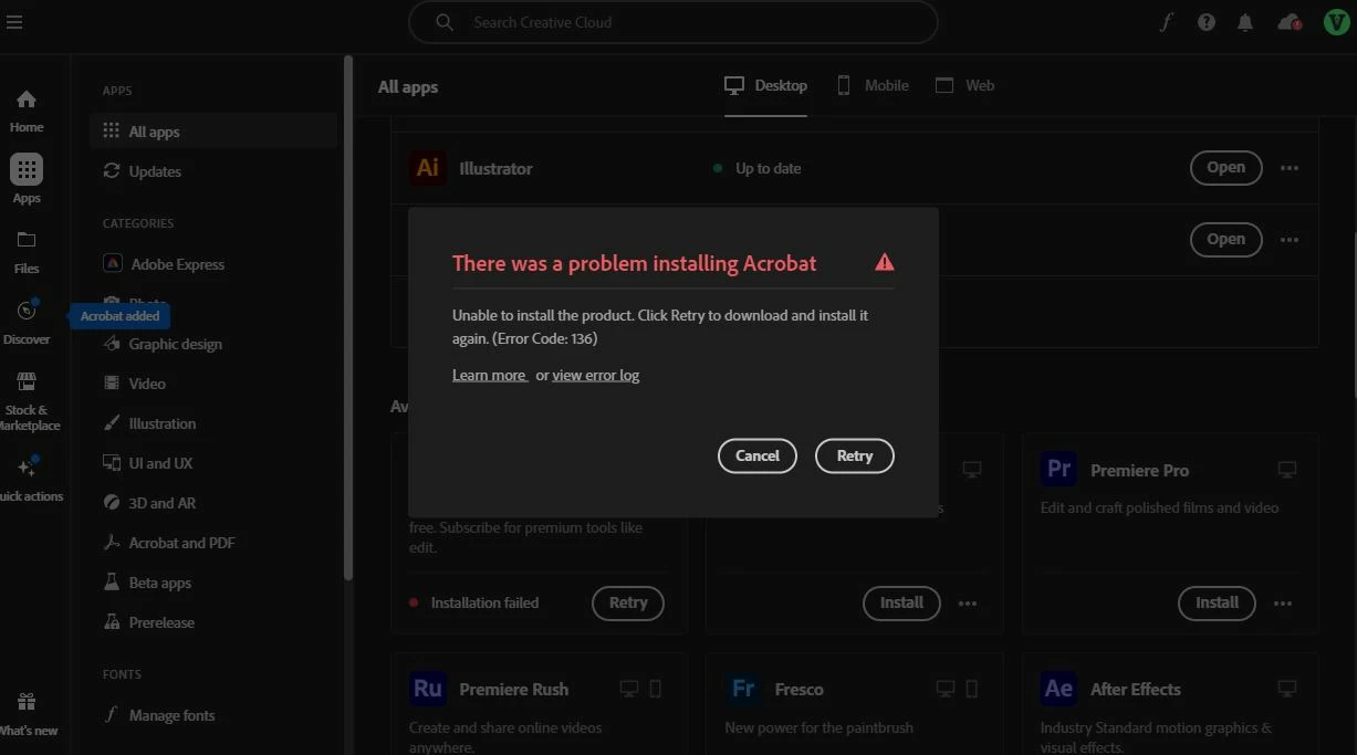 Unable to install Acrobat. Error code: 136
