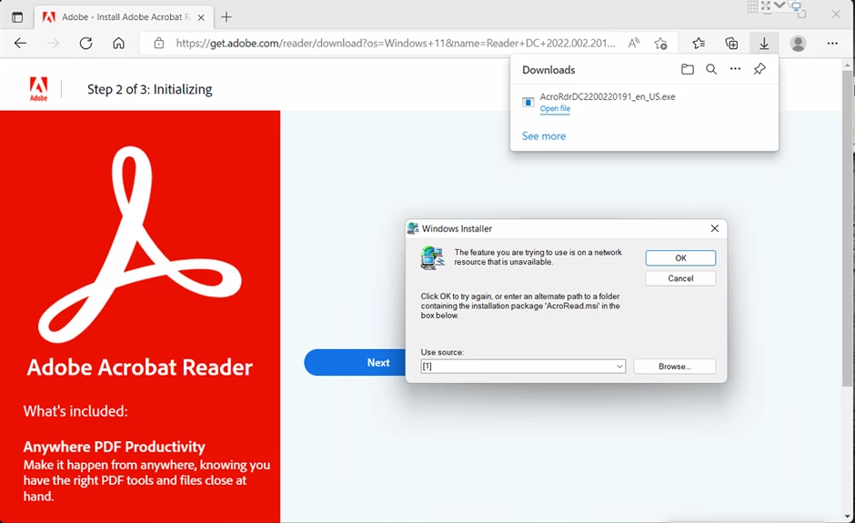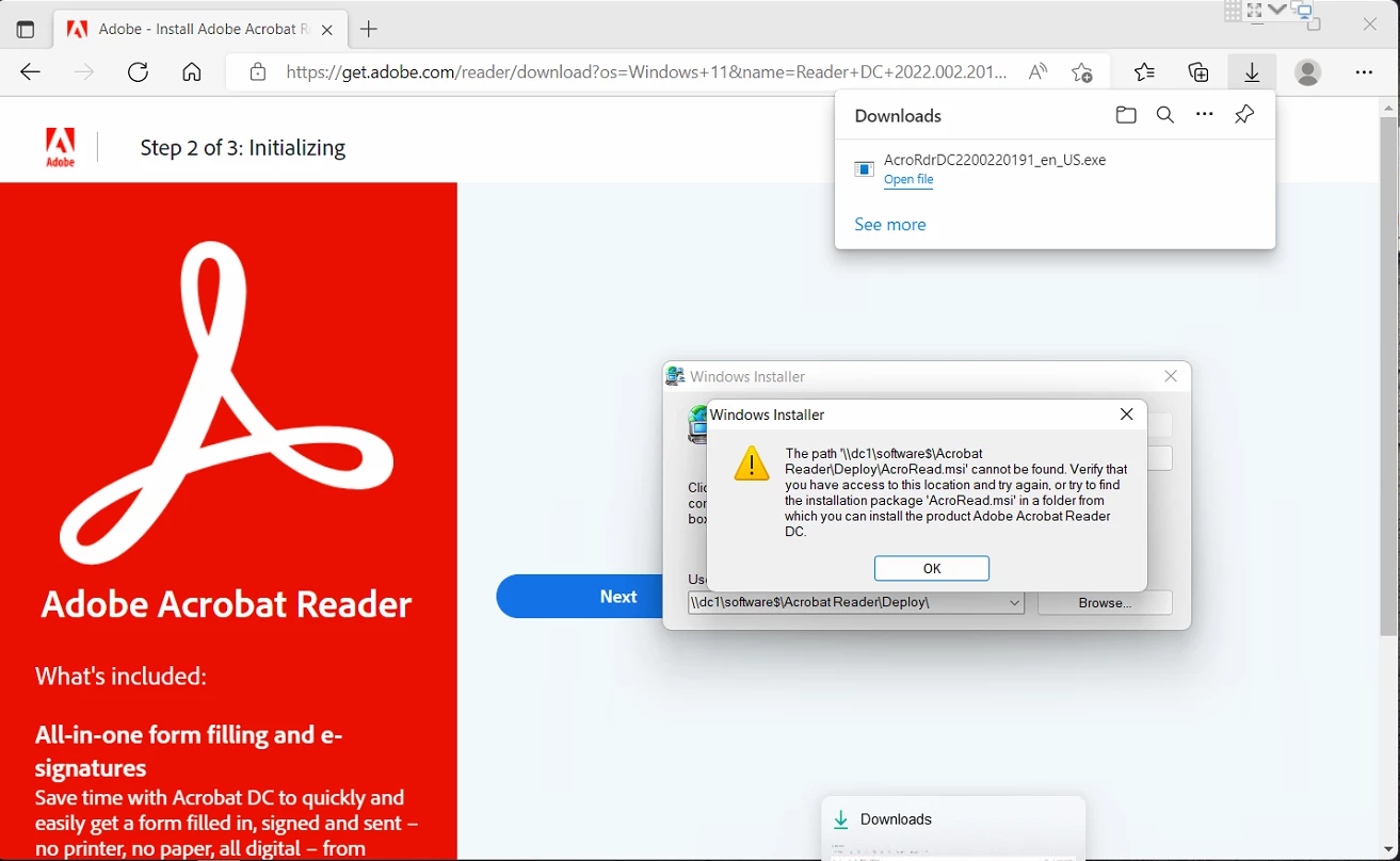 Tried to run the installation from this link, https://get.adobe.com/reader/ . It gave an errror message that i need to uninstall the older version to continue with the installation. I have alrady uninstalled it but i went and double checked and then downloaded the Clean up tool, it ran succesfully. Tried again and now i'm getting these errors, please see screenshots attached.