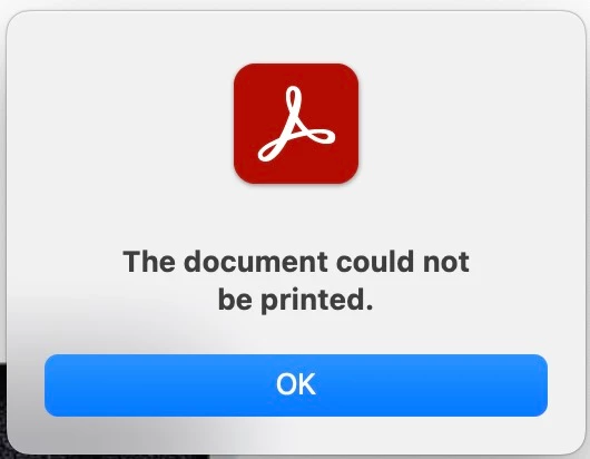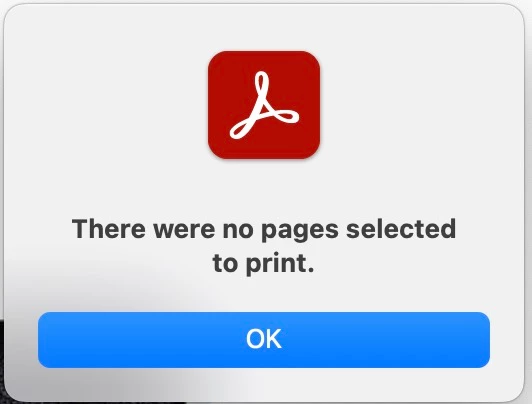 Why can't I print from Acrobat? See screenshots. I get an error message of "unable to print" followed by another which says no page selected. As you can see from the print dialog box, pages ARE selected. Adobe's troubleshooting article is of no help with this.