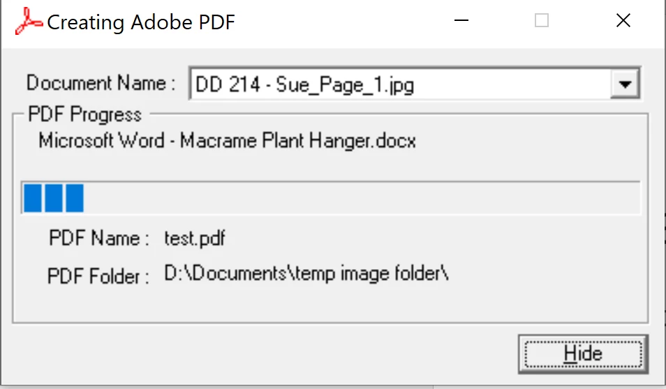 Since the last update I have not been able to print to Adobe PDF. When I try out of MS Word or Excel, it opens the location to save the file then nothing. Nothing happens. I just tried to printn out of Photoshop. It appeared to start working then the progress bar just stopped. I thought perhaps it was stuck due to the size of the file so I opened Word and tried printing from there. I got the same stuck screen but notice the document name (for the file name I typed in "test") vs the PDF progress bar. The document name is the file I tried to print from Photoshop.