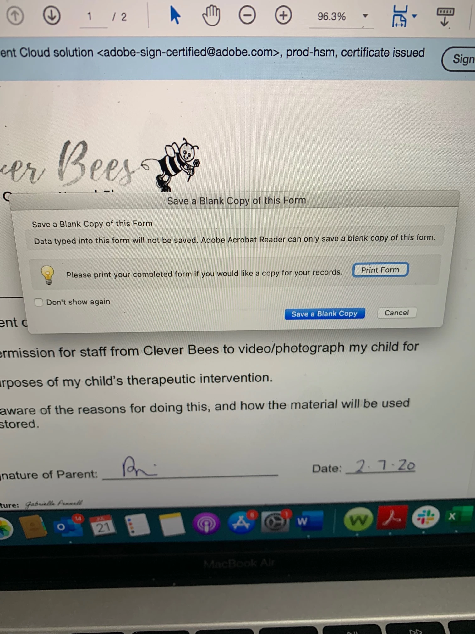 "Save a blank copy of this form - Data typed into this form will not be saved. Adobe Acrobat Reader can only save a blank copy of this form"