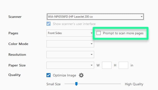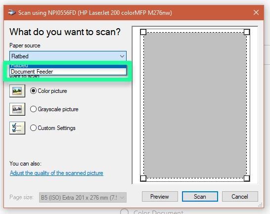 I am running Adobe Acrobat Pro DC on my Windows 10 laptop. Adobe will not take documents from the scanner on my HP Office Jet Pro 8715 printer. It will only scan a single page at at time from the glass. How do I change this?