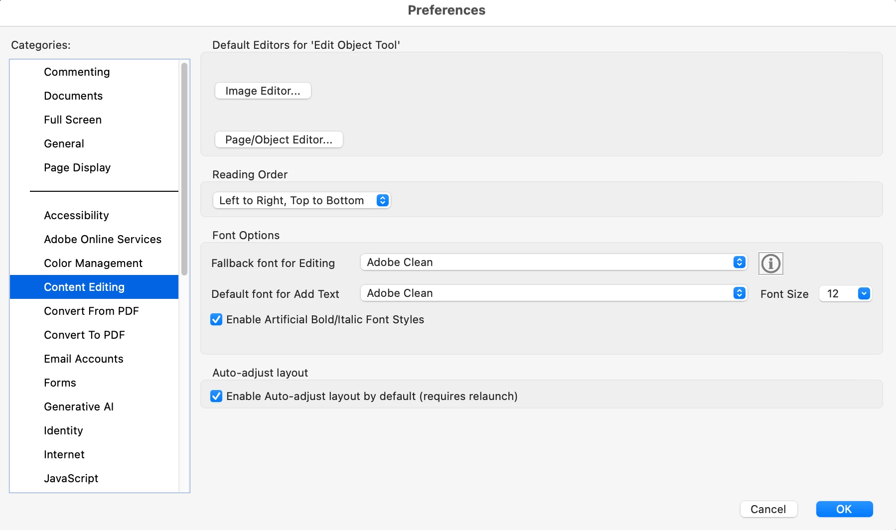 - Navigated to Acrobat/ Preferences / Content Editing