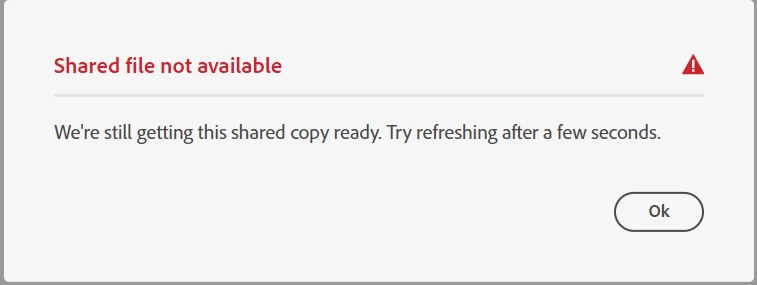 Hi I'm unable to share my file in any form. It allows me to create a link or email as my sharing options. However, when I hit create or send the message "Your file is uploading to Adobe's cloud storage, but you can share the link immediately." When the link is shared this message is displayed