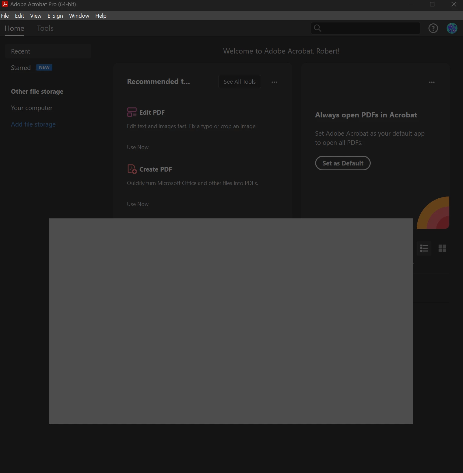 I've just installed Adobe Acrobat Pro and when I open the application, it starts okay and then after 20-30 seconds a grey window appears with a spinning blue circle which I assume is a loading bar however it's blocking me from using the application and isn't going away. I've left it for 30 minutes and there is no change. I have the creative cloud for the desktop and it shows that the application is up-to-date I'm all logged in but nothing is happening. Any support or help would be appreciated.