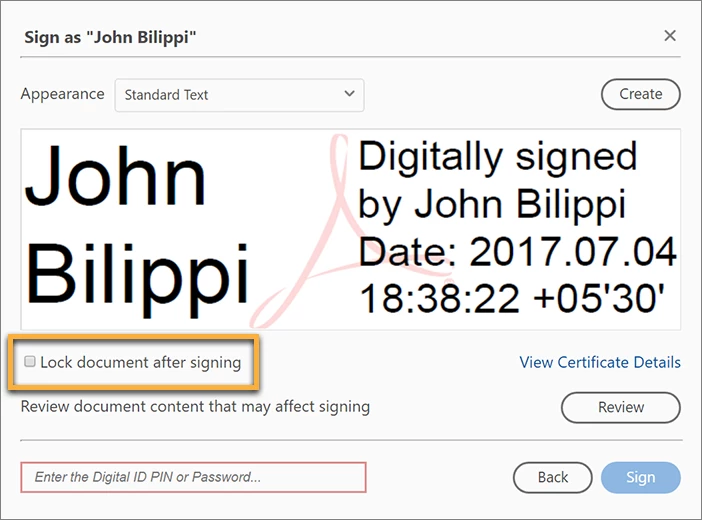 If you're expecting others to sign the PDF, don't select the Lock document after signing option in the Sign As dialog box or the Sign Document dialog box.