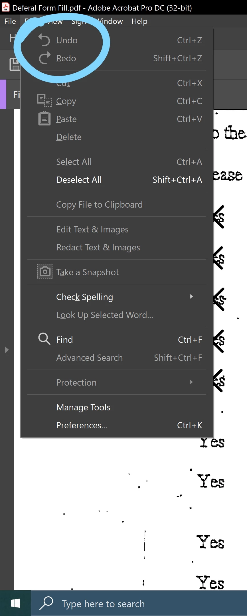 Hi. I use Acrobat DC regularly. Currenlty I am unable to Undo ro Redo anything. The options are greyed out. I opene document, and am using the Edit PDF option. I would appreciate any suggestions. - thanks.