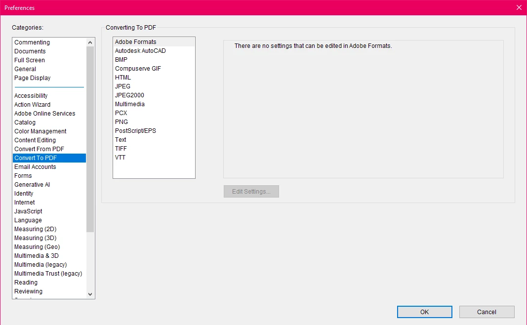 It is my understanding that more file types than this should be supported. If you mouseover 'create a PDF' it even lists word documents as a viable file type. Yet, my Acrobat refuses to do so. I'm aware there are workarounds, and I can still find the file in file explorer etc, right click it and convert it, but I'd still like to know what the issue is with the actual program. To a semi-competent computer person, my only guess is that the program files are missing that are supposed to support those file types, but if it's not that then I haven't got a clue. The whole program has been deleted (every last tiny hidden file) and reinstalled by customer support.