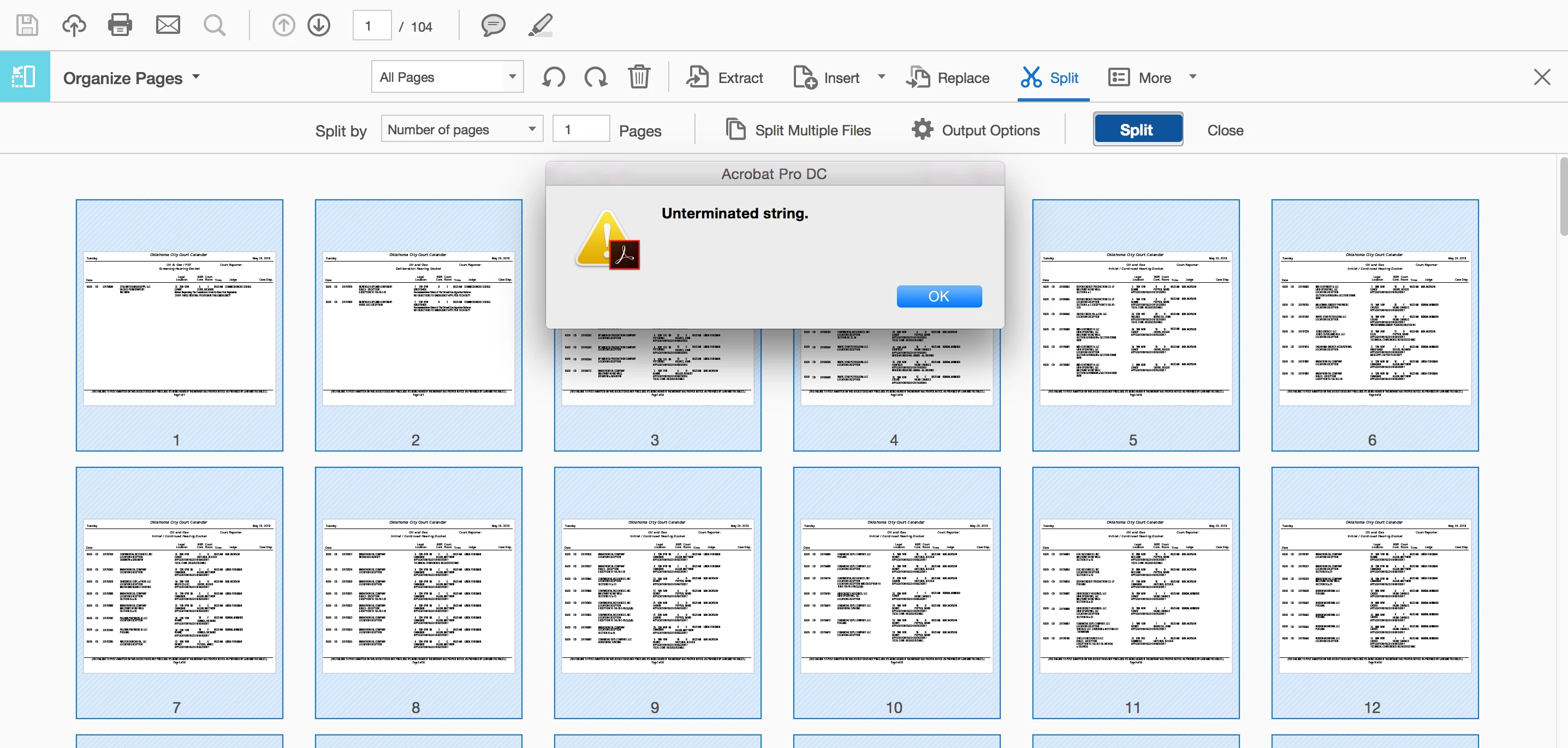 I am trying to split a 100 page(or so) document into 100 single page documents. I have done this many times before but, now when I try it a message saying "Unterminated String" pops up. Does anyone have an idea of why this might be happening? I have included a screenshot below. Thanks!