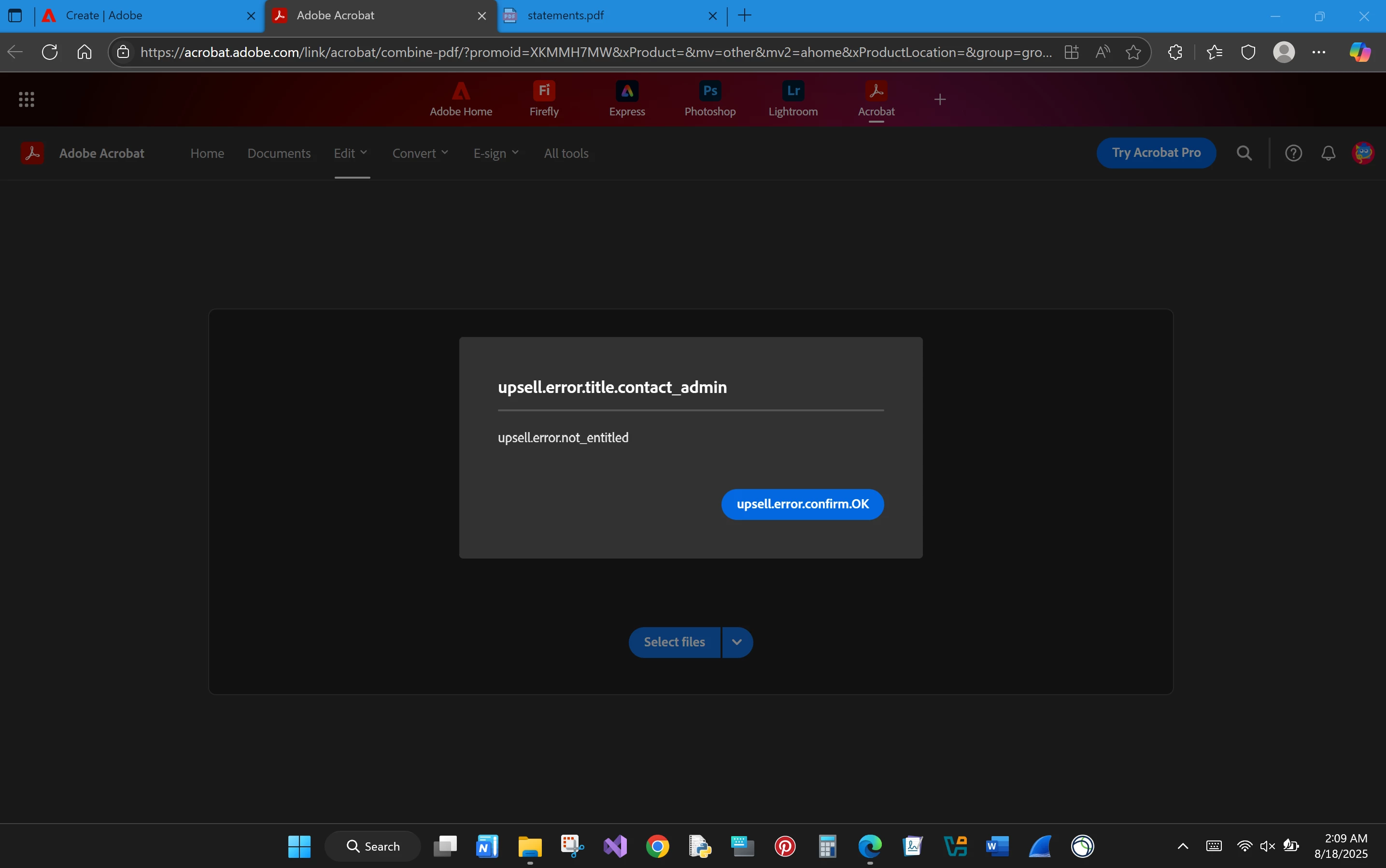 @chasityandrea it appears you are using the online app of Acrobat. I would make sure you are logging into the correct adobe account. I have two subscriptions, one for work, and one for personal use, and I sometimes use the wrong account. The error message is referring to your account's licensing or permissions, your account is not "entitled" or authorized to use the specific feature you are trying to access and advises you to contact an administrator.