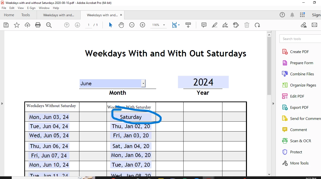 I am working on a pdf that has a month and year section at the top and autofills the weekdays, with and without Saturdays.