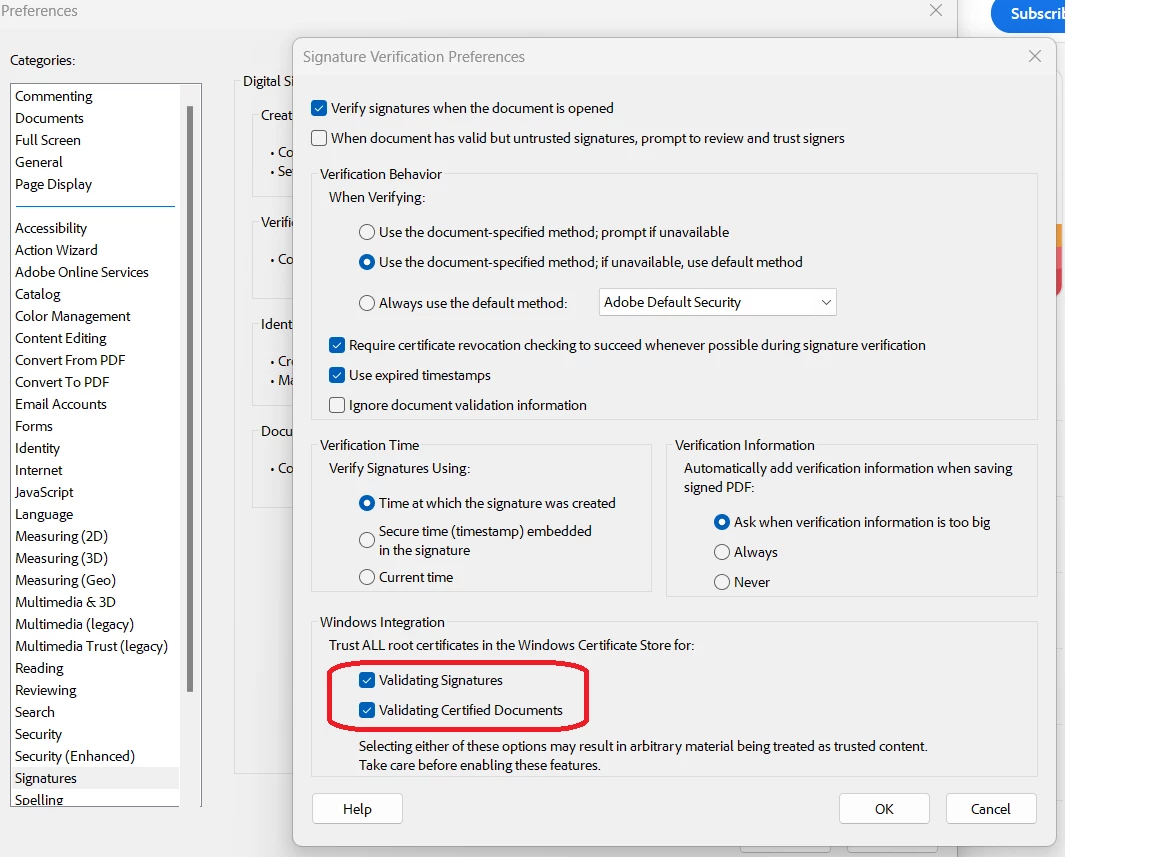 files> preferences>signature>Verification(more) & check the boxes as highlighted in attached image