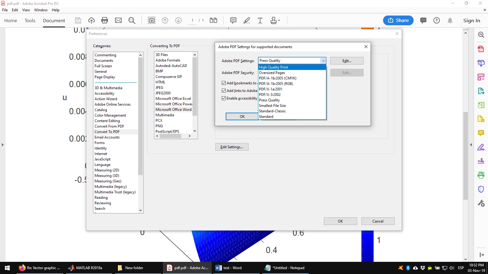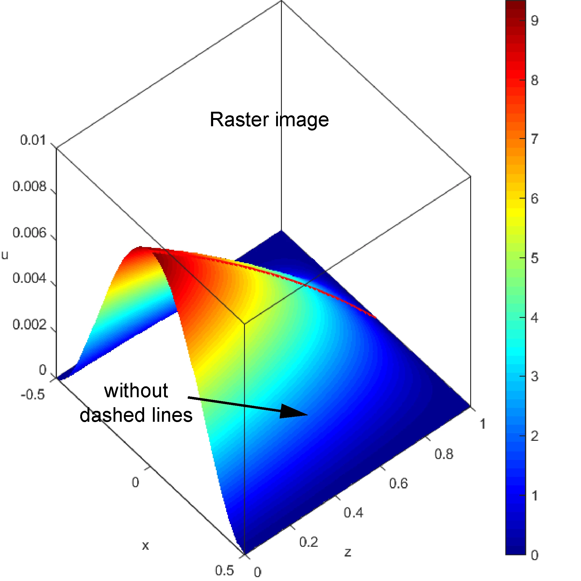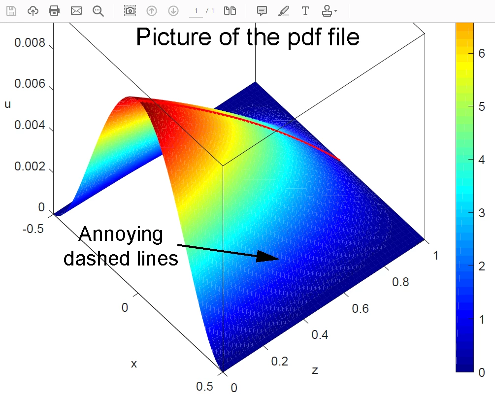 I have a graphic created in MATLAB and saved to pdf. When I open the pdf file, the surface of the graphic has a lot of white dashed lines that are not present in the original graphic. However, when I open the same pdf file in Illustrator those lines are not present.
