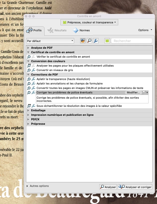 Lorsque je reçois des PDF avec textes non vectorisés, je suis amené à le faire moi-même sous Acrobat afin de respecter le flux de production de certains fournisseurs. Ne disposant pas des polices, il me semble qu'il s'agissait d'un onglet dans le prépresse ? Cette fonction est-elle déplacée dans d'autre outils ?