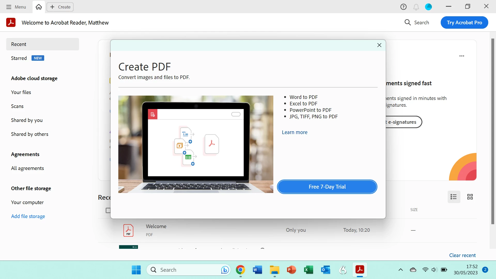 MMatthew30154261lyobParticipantForum|Forum|2 years agoMay 30, 2023QuestionViewing pdf stopped by offer free trialForum|Forum|2 years agoMay 30, 20232 replies1593 viewsHi, everytime i try to open pdf I get offer of free trail to create pdf and convert to pdf's. Don't need this ATM. Ca't get rid of it or go round? Any suggestions please? picture attached.thanksMattHow toCreate PDFsGeneral troubleshooting