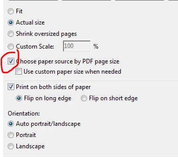 I have pressed "choose paper source by pdf page size", going to page setup and choosing custom size. but it still defaults to A4.