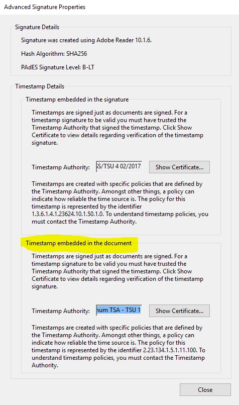 I have a PDF file that contains a signature with signature timestamp (I guess it is called in Reader "timestamp embedded in the signature") and also a timestamp embedded in the document. But I don't know what it means. Specifically what kind of timestamp it is..