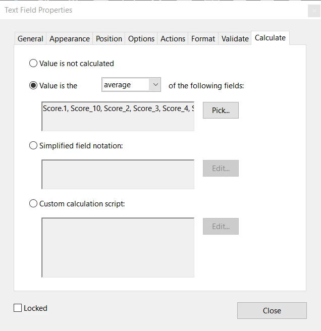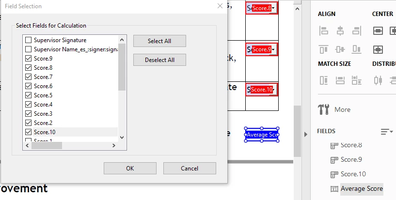 @chrissy_8224 I think it may be the text fields aren't named in a way that Acrobat can recognize for calculations. To fix this, go back and rename the text fields. Simply click on each field, find its properties, and give it a simple, unique name without any spaces or special characters, like "Score_1," "Score_2," and so on. This will allow Acrobat to "see" and use them in your calculations properly. Once you've renamed them, the selected fields should appear correctly after you hit "OK."