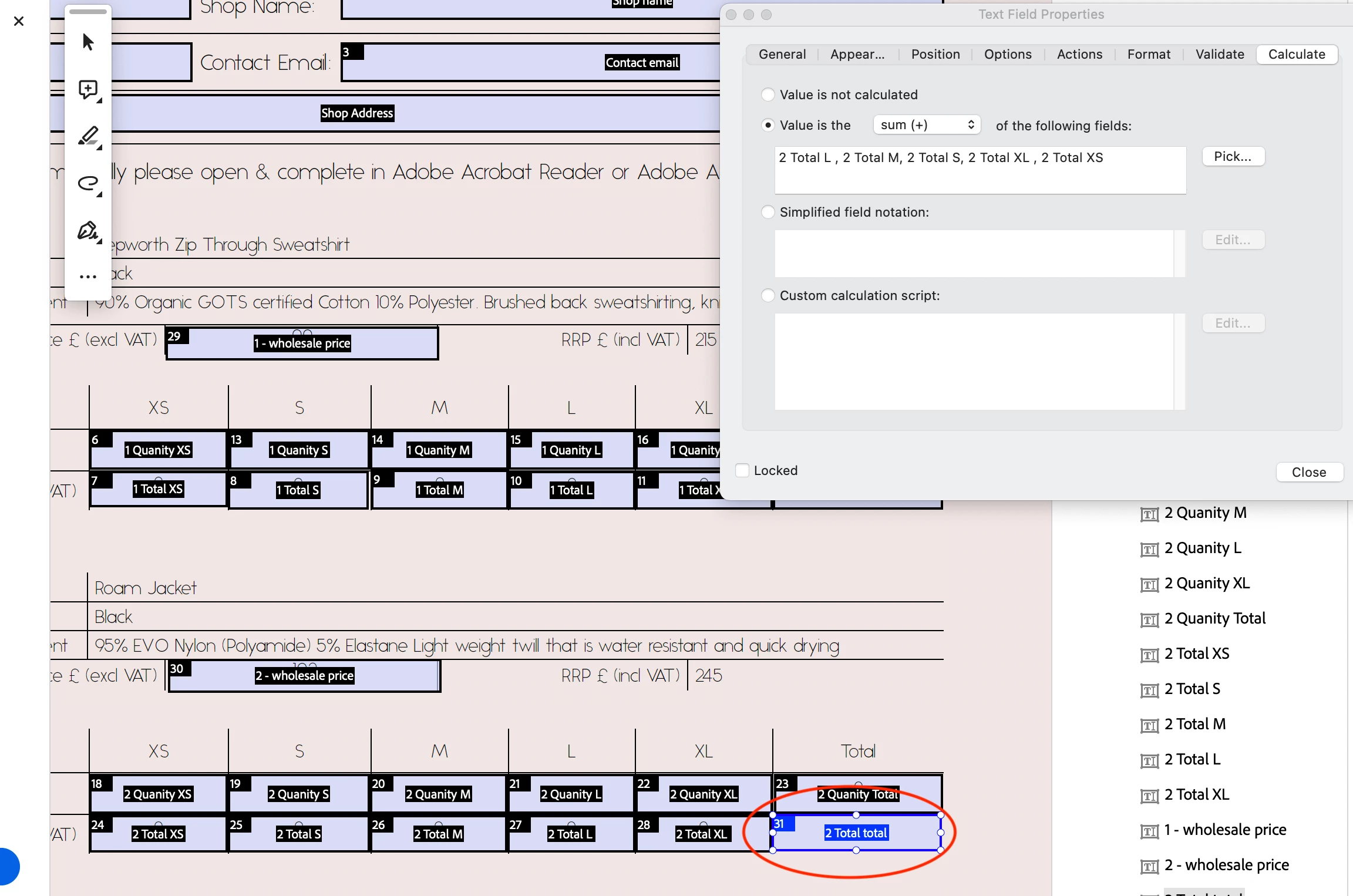 Hi, I have created a interactive form with InDesign and have now added all the calculations to the form in Adobe Acrobat. Everything is working well, apart from one text field which just does't show anything. from looking at the properties of the field everything should be working well with the calculation, format, etc.