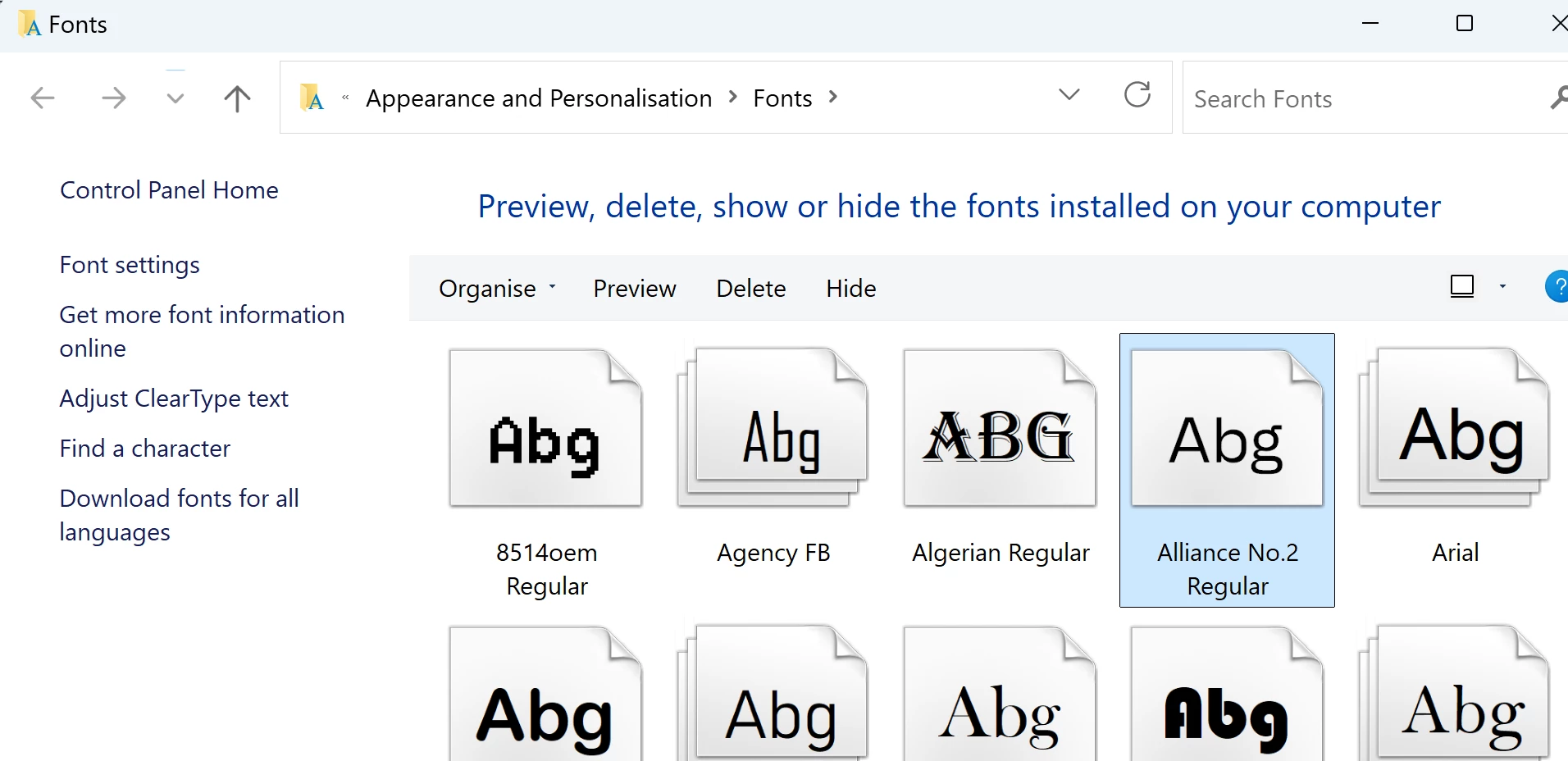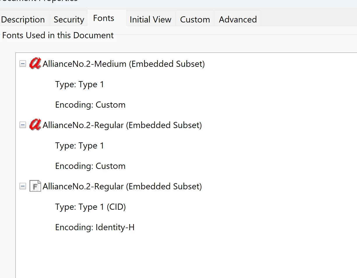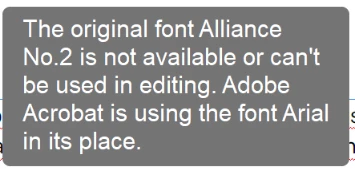 Alliance No. 2 is installed in Windows fonts and is fine in Office applications. In Acrobat under "fonts used in this document" it has the font listed three times: