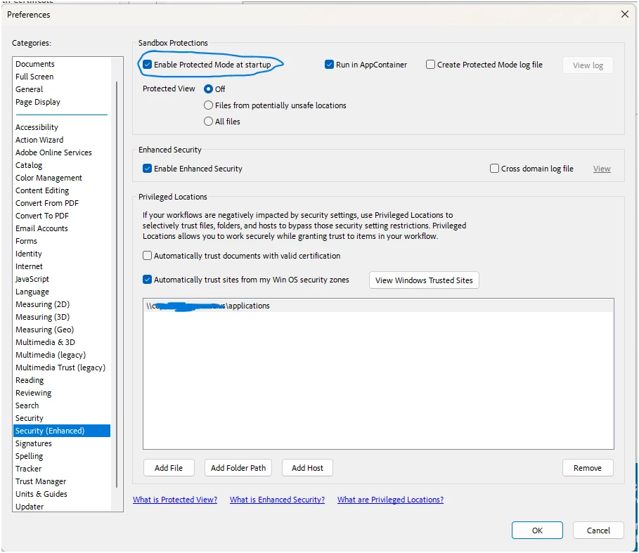 I've added the folder path to the "priviledged locations", but the issue still occurs. I've of course rebooted and tried it with different users on different PCs. It is not a unique user or windows file permissions issue. Please, we need the "save" button to simply work when it's on a network share after the change, like it does when the file is on a local drive or when protected mode is disabled.