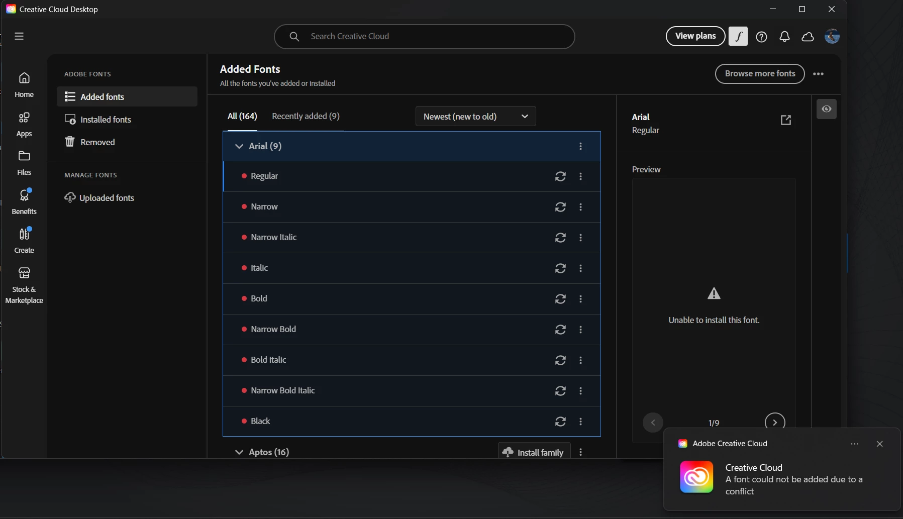 What you are seeing is that the Arial font was trying to load though the Adobe fonts. (They have the “Microsoft” fonts available.) Windows already has Arial fonts installed as part as the base OS fonts, so the Creative Cloud app can’t install a duplicate. I suspect it probably available from Adobe for Mac users since every Windows computer already has it.