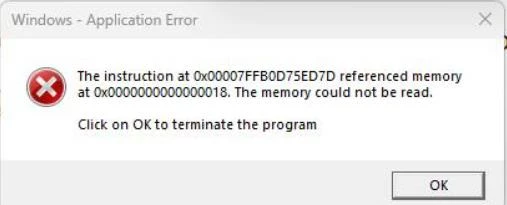 Windows Application Error - The Memory could not be READ