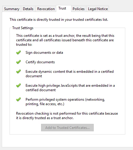 Under trust tab for particular certificate, the image looks as given below. Also, I have unchecked "use modern interface for signing" under application preferences / signatures / creation and apperance and that did not help. (With "modern interface" option there was no error message but the button "sign" was not resulting in anything and after reading through forums I could see that unchecked option might help. After unchecking I was able to see the error).