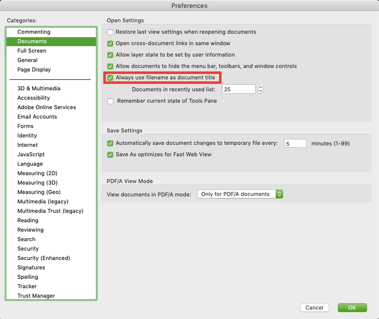 I am working on an iMac using El Capitan 10.11.6. Until last week, when I upgraded to DC, hoping it would solve my problem (did not) I was using the previous version of Acrobat Pro. Regardless of version of Acrobat, whenever I open a PDF that came originally form a Word file, the wrong file title appears in the title bar above the page. Instead of "BigFile-Client ABC-2016" the title will be what it was in Word the first time I made the file "BigFile-GENERIC-2009" Even if I resave the file, add or subtract security, close and reopen, the name in the title bar is still wrong, and always an old name from years ago. This is a problem since I am customizing the same document for different clients and changing the names so I can tell them apart. Oddly enough, if I save and close the file, it appears in the desktop with the correct name and this does not happen at all with files that were originally made in InDesign. This problem just started a couple of weeks ago. Any ideas? What could have changed to cause this to just start happening?