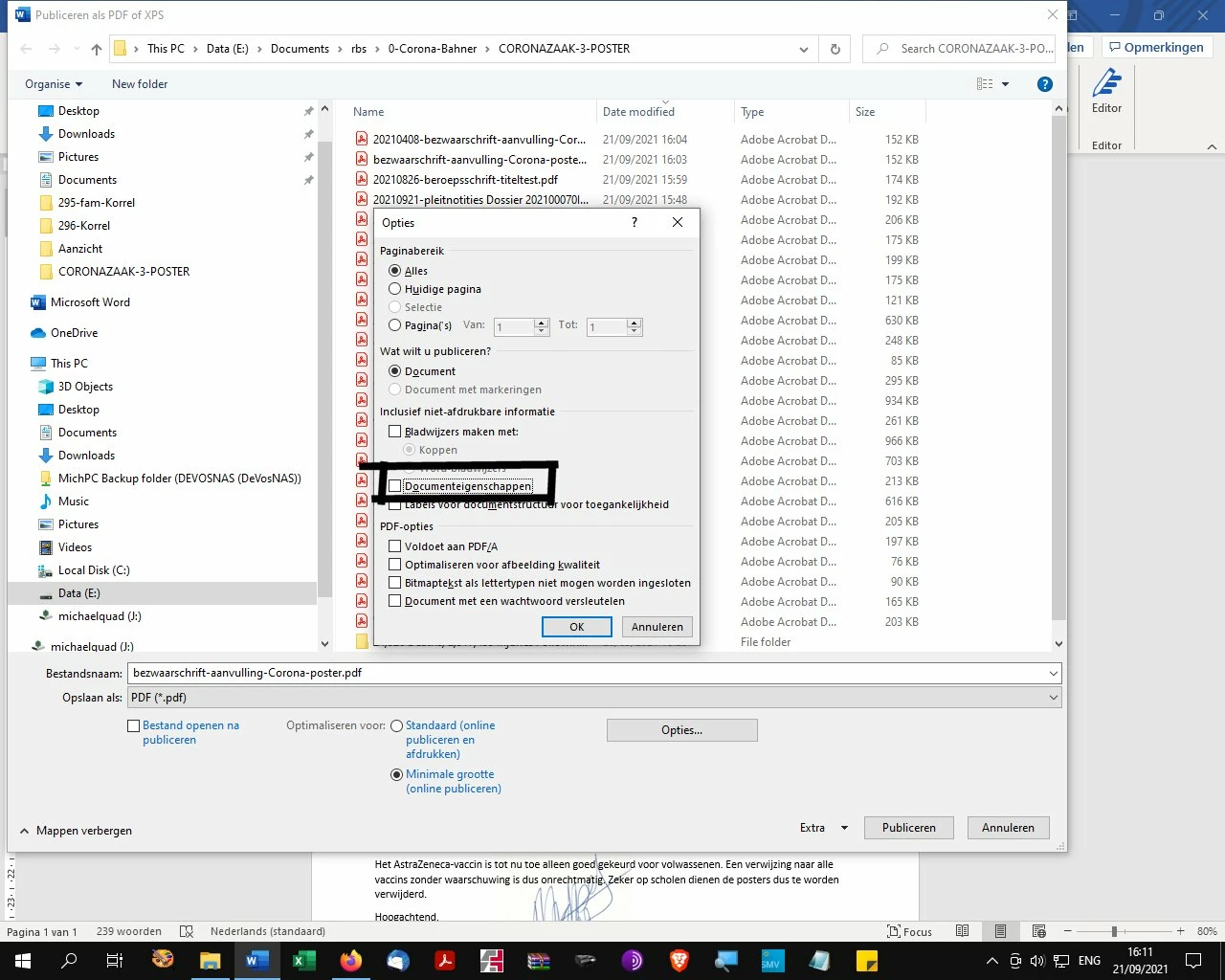 Sorry to answer this late... I was looking for the problem too. I worked out my own solution after having tried some of the answers (tha didn't work). Whate did work:  I exporter the Word file tot PDF-format. Before publicizing, I clicked "options" and disabled "documentproperties". See attachement.