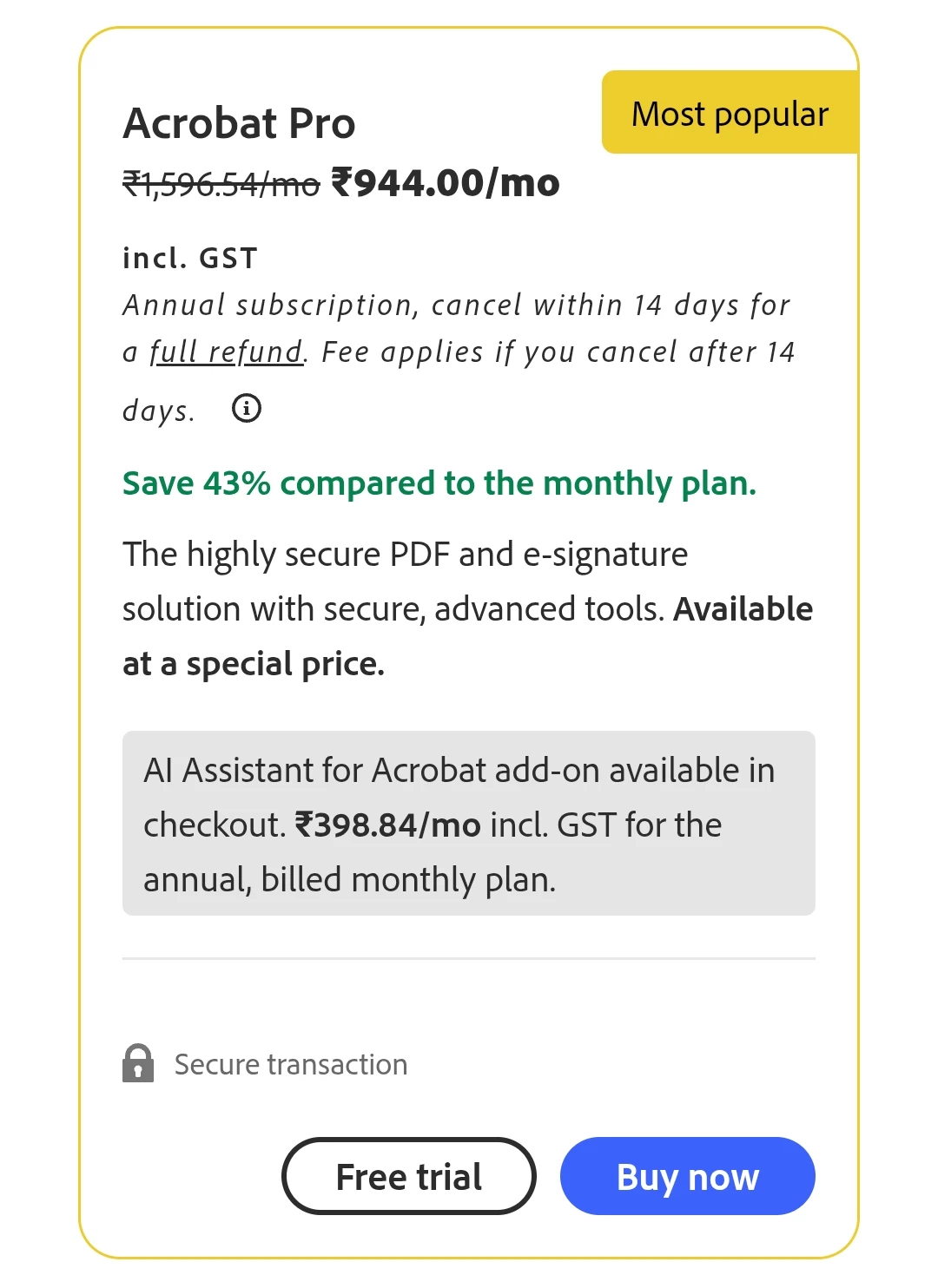 2 months back, Adobe reduced its Acrobat Pro pricing from ₹1596.54/month to ₹944/month billed annually. This affects the users who have previously bought the annual plan at MRP. Hence, I kindly request that the company take this into consideration and offer an appropriate price concession to long-time users.