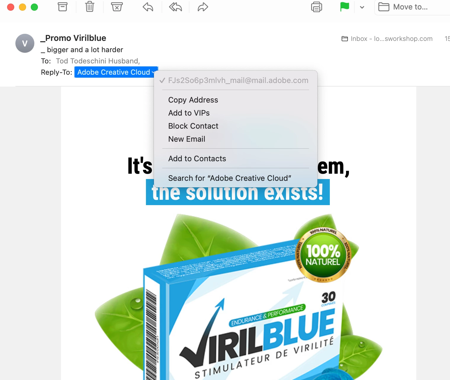 We have received about 10 of these a day for the past month or so from Viril blue.  The reply address is always the same format, a mixed load of letters etc them mail@mail.adobe.com.  MrrGXECd1DaJo_mail@mail.adobe.com.   adobe.mail.  We have received so many would anyone be alble to shed any light as to where these may come from.  Thanks!