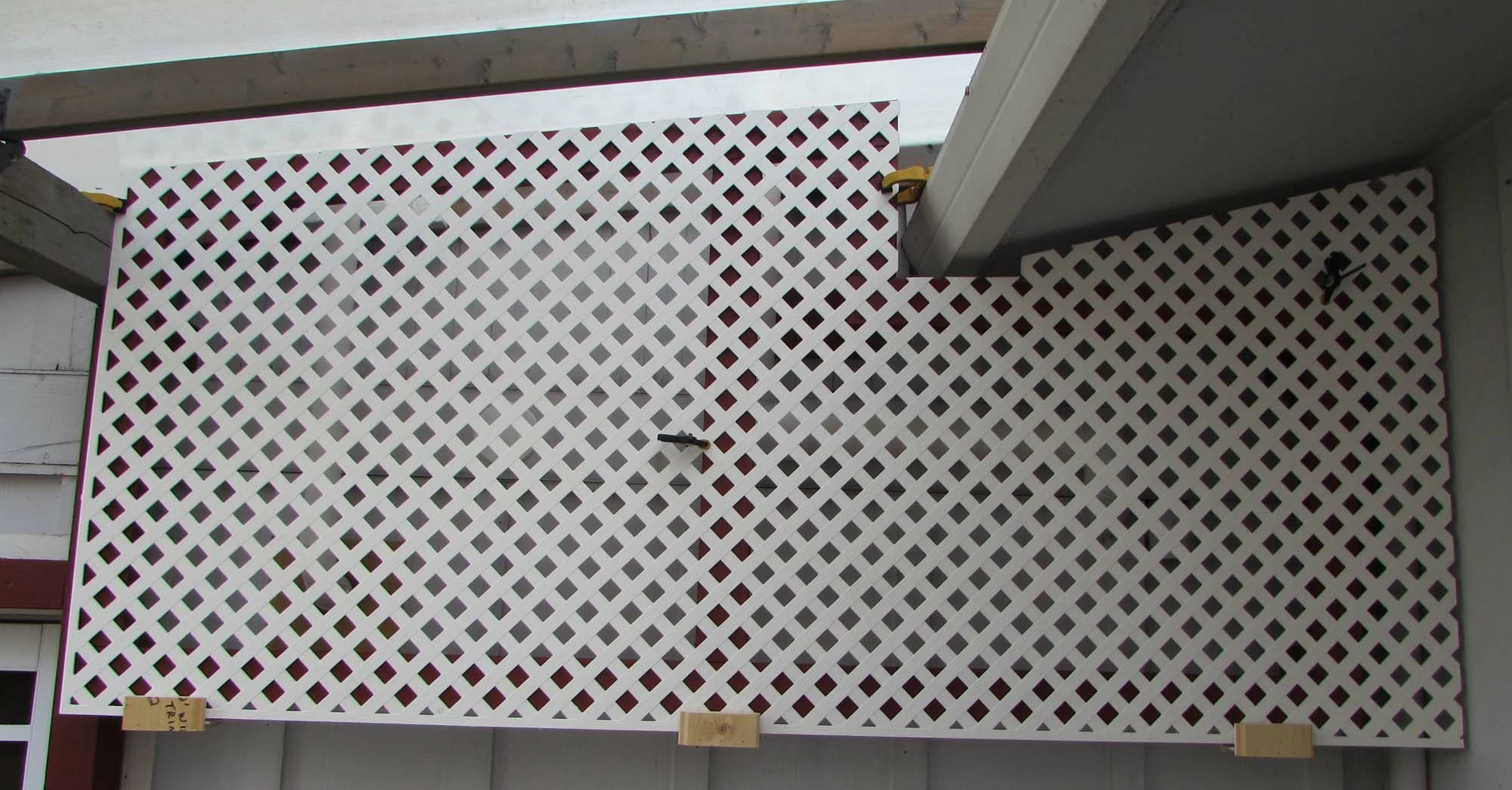 To hide the pipes I built a red painted 2x4 frame that will, after the weather is warm enough to put a fresh coat of paint on the garage wall, have SMALL hole lattice cut and mounted