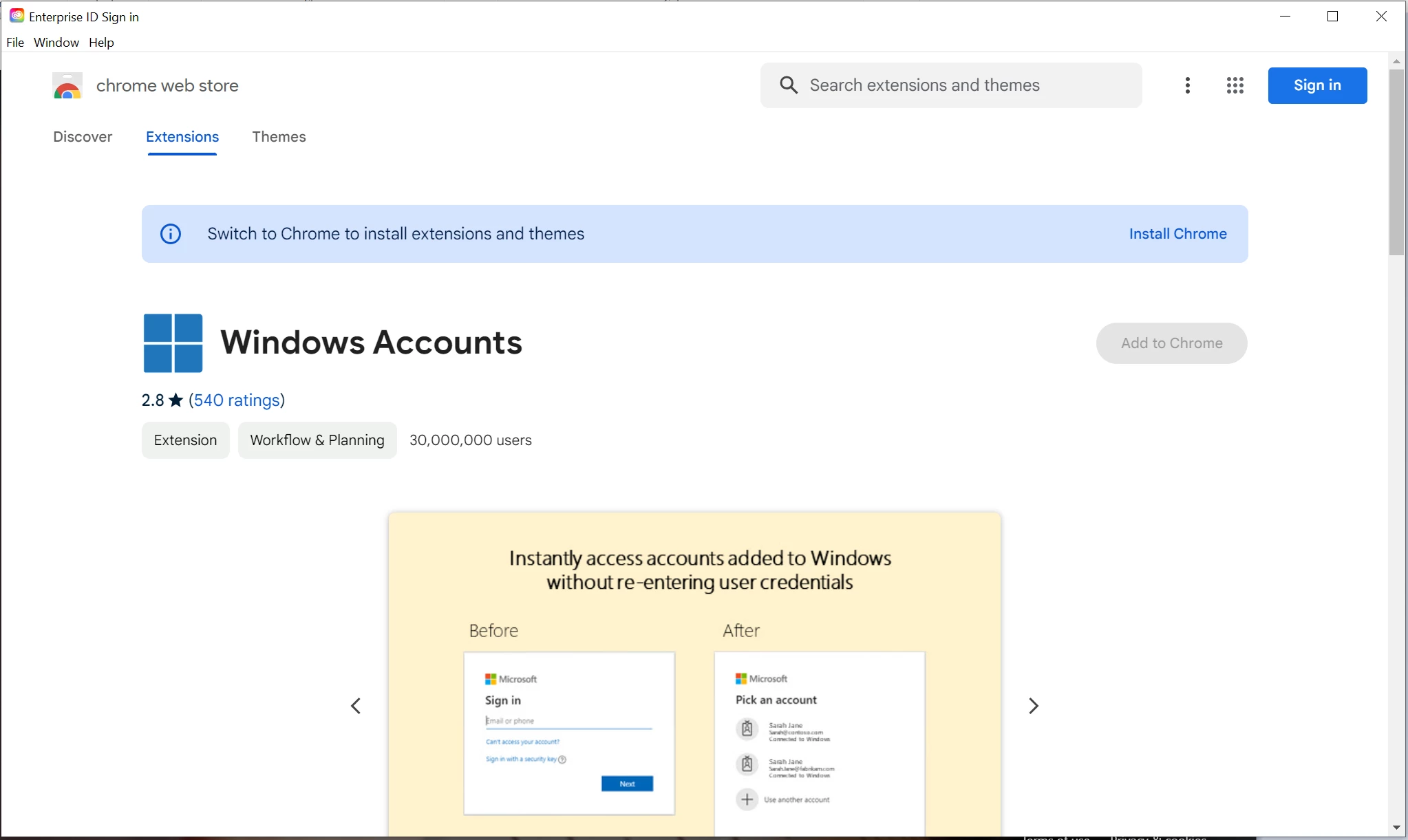 You can see the Windows Accounts extension is greyed out because this sign-in portal isn't chrome. So I can't sign in because it's a chrome portal and I can't pass my enterprise security because it's not chrome. Any guidance would be appreciated. Thanks.