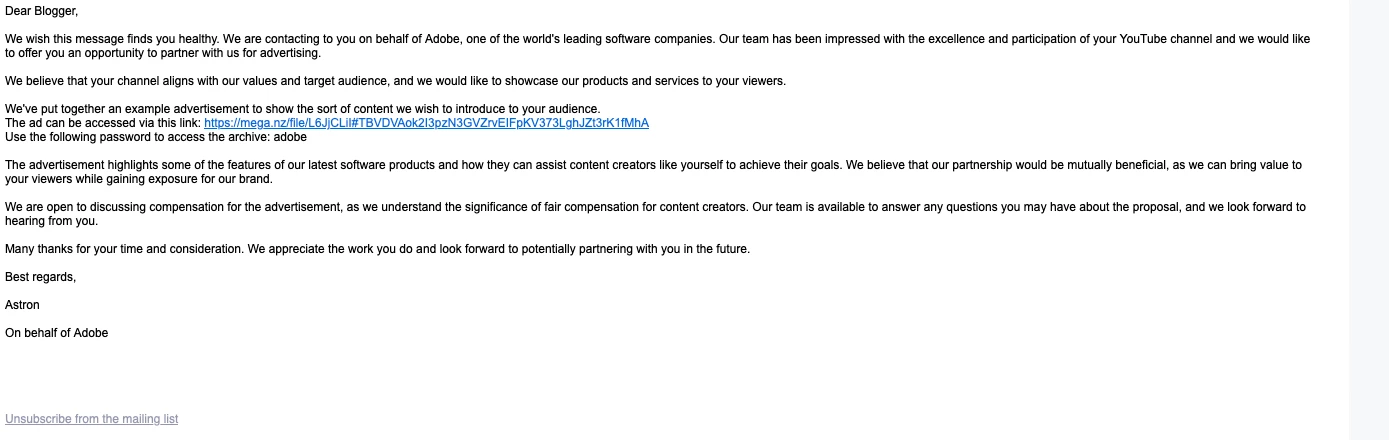 This morning I received an email titled Promotional video proposal from hello@adobepromo.com -- the URL adobepromo.com is insecure and shows a bunch of animated dots and boxes.