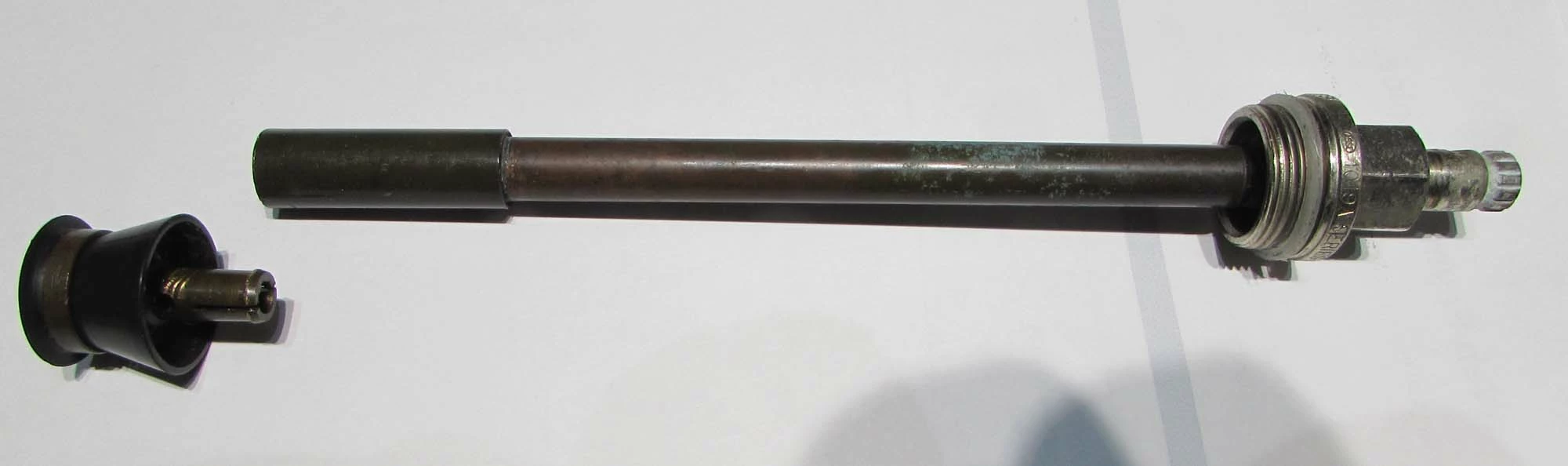 Picture one is the 6.5" valve stem that goes into the house, with the piece to the left being the holder for the rubber gasket that stops the water (deep inside the wall so the faucet won't freeze in the winter) when the handle on the outside is turned... the gasket assembly is 'free floating' inside the hollow valve stem, with the shape of the rubber flange designed so water will go past the sloping rubber when the valve is turned to open... the rubber flange is there to keep the valve stem centered inside the hollow faucet assembly
