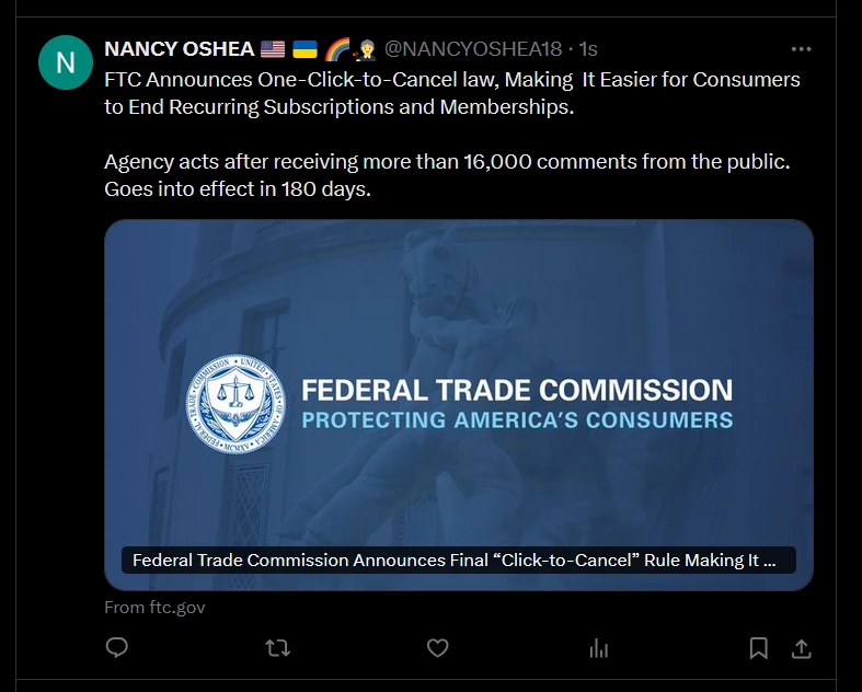One-Click-To-Cancel Law Goes into Effect in 180 days.