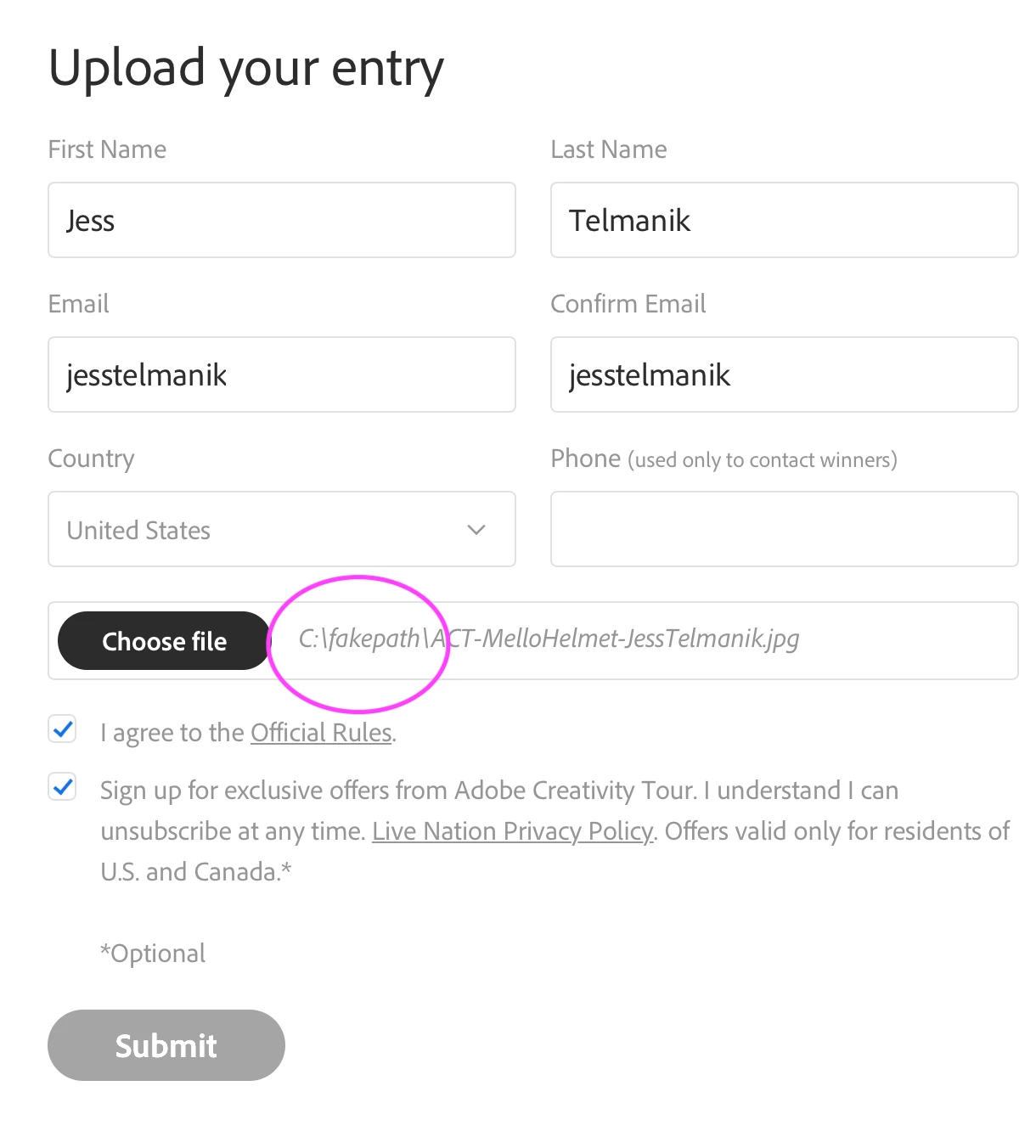 No matter what I do... when I go to submit my entry (I've tried on a Macbook, Laptop PC, iPhone 8 and iPad Pro) no matter the file size or file type (jpg or png)... the Submit button remains greyed out... and the deadline is today for submission... I'm not sure if the "fake path" that shows is part of the issue, but I'm seeing this on every device I try and upload from...