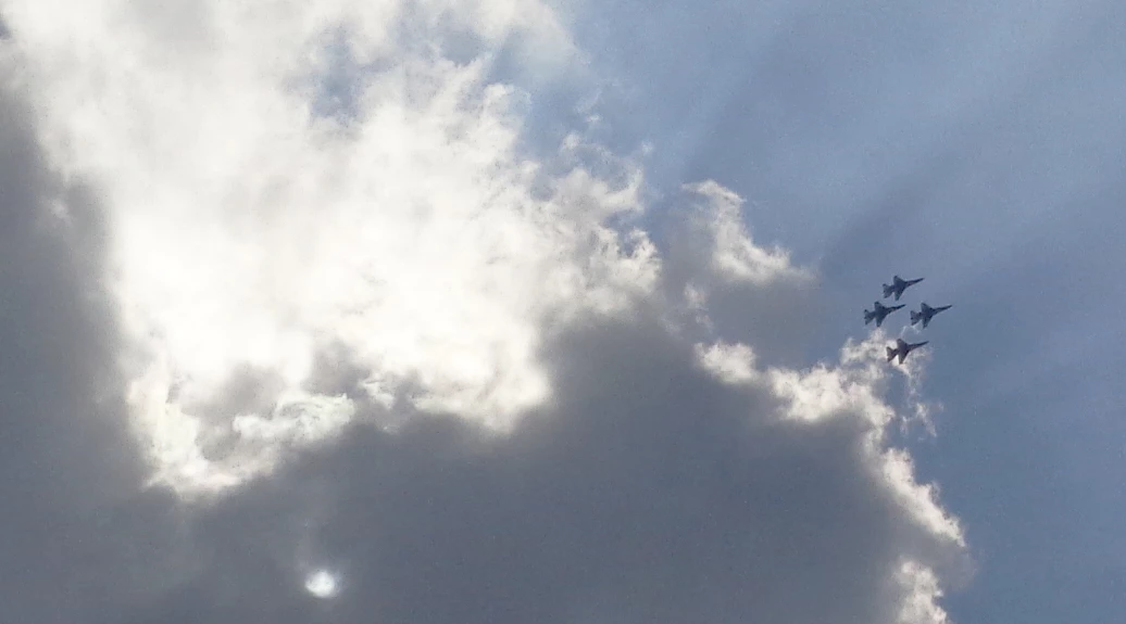 The picture is a lot bigger and shows much more of the cloud and sunbeam they emerged from but I wanted to frame as much of both as I could. At times they buzzed our house just a few hundred feet high but they were too fast for me to catch a shot. My neighborhood has a lot of tall trees, by the time I heard the roar of their jet engines they'd passed and gone. There were four and then eight and four again. They flew for about an hour it was a real treat to see them zooming around having a blast and showing off their aerial skills.
